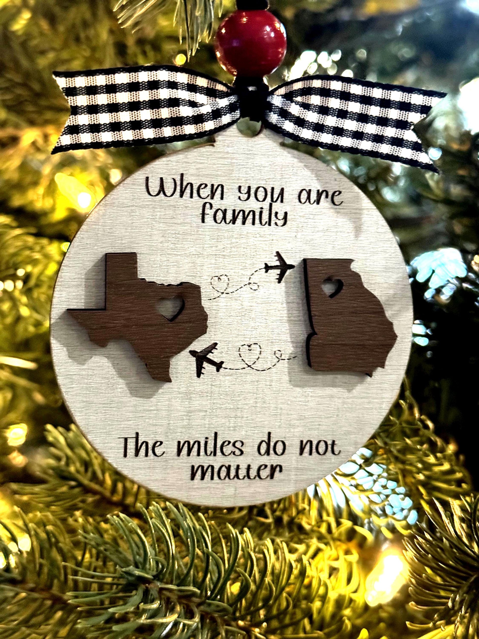 Transform your holiday decor with our personalized made in house a tribute to families that live miles apart. Simple design which is crafted for a touch of rustic elegance with a plaid bow and/or wooden beads. This classic design will look great on your Christmas tree for years to come!