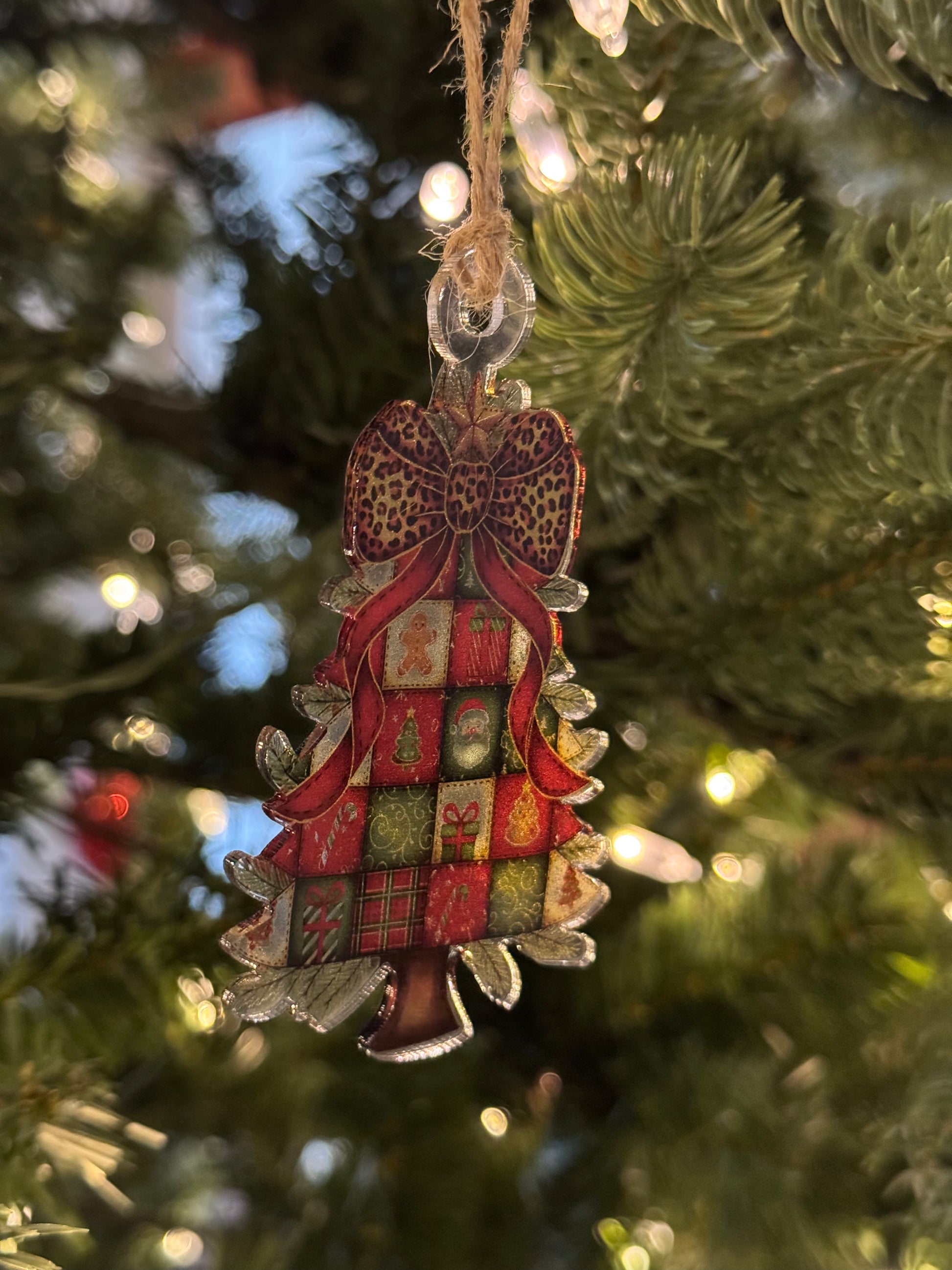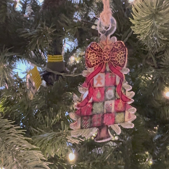 This boho-inspired Christmas tree ornament captures festive elegance with its striking cheetah print bow detail. Crafted from premium clear acrylic, the design mimics the luminous quality of stained glass, casting beautiful light patterns when displayed. Standing at approximately 2.75 inches, it's the perfect size for any tree branch or as a standalone decoration. The sophisticated blend of natural bohemian aesthetics with bold animal print creates a modern yet timeless accent that complements both traditional and contemporary holiday décor.